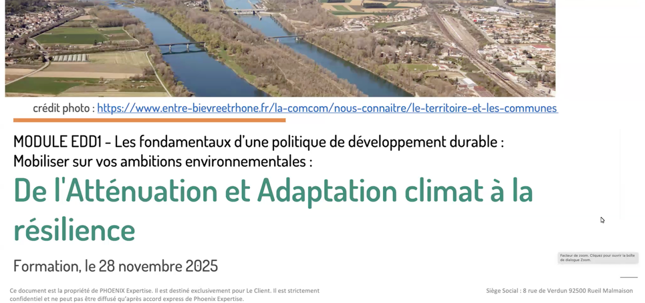 Dans le cadre de l'évaluation mi-parcours du Plan Climat, les élus de la Communauté de communes ont participé à 5 séances de webinaires. Cette deuxième séance a permis d'aborder l'adaptation au changement climatique dans l'habitat. Formation réalisée par l'institut Supérieur des Élus le 5 décembre 2025 et animée par le cabinet Phoenix.